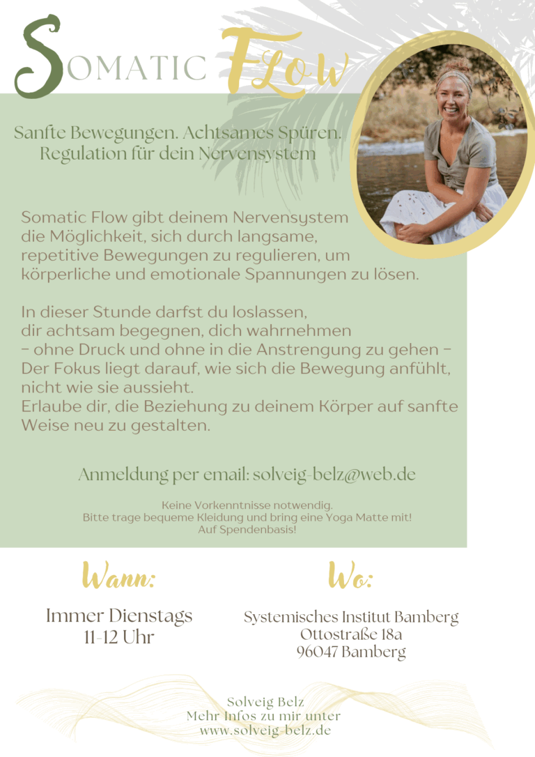 Desweiteren biete ich Somatic Flow auch für Organisationen und Arbeitgebende und deren Teams an. Mehr Infos dazu bitte per Email: solveig-belz@web.de